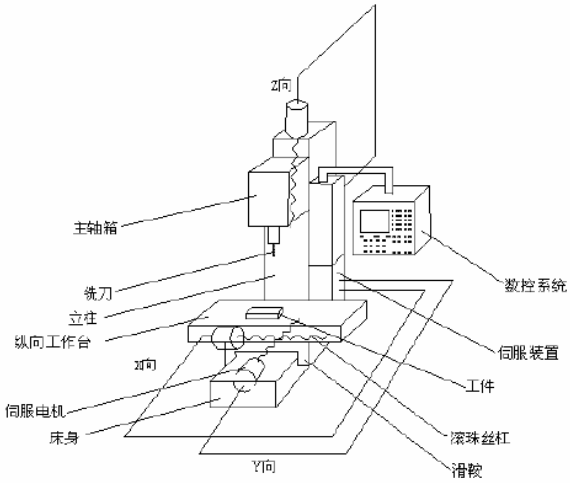 數控銑床又稱為CNC(Computer Numerical Control)銑床,即計算機數字控制銑床,其基本原理如圖所示。數控銑床可以根據零件形狀、尺寸、精度和表面粗糙度等技術要求制定加工工藝,選擇加工參數,通過手工編程或利用CAM軟件自動編程,將編好的加工程序輸入到控制器??刂破鲗庸こ绦蛱幚砗?,向伺服裝置傳送指令。伺服裝置向伺服電機發(fā)出控制信號。主軸電機使刀具旋轉,X、Y和Z向的伺服電機控制刀具和工件按一定的軌跡相對運動,并加以一系列的輔助動作,從而實現零件的輪廓、型腔、鉆孔、攻絲等工序的加工。